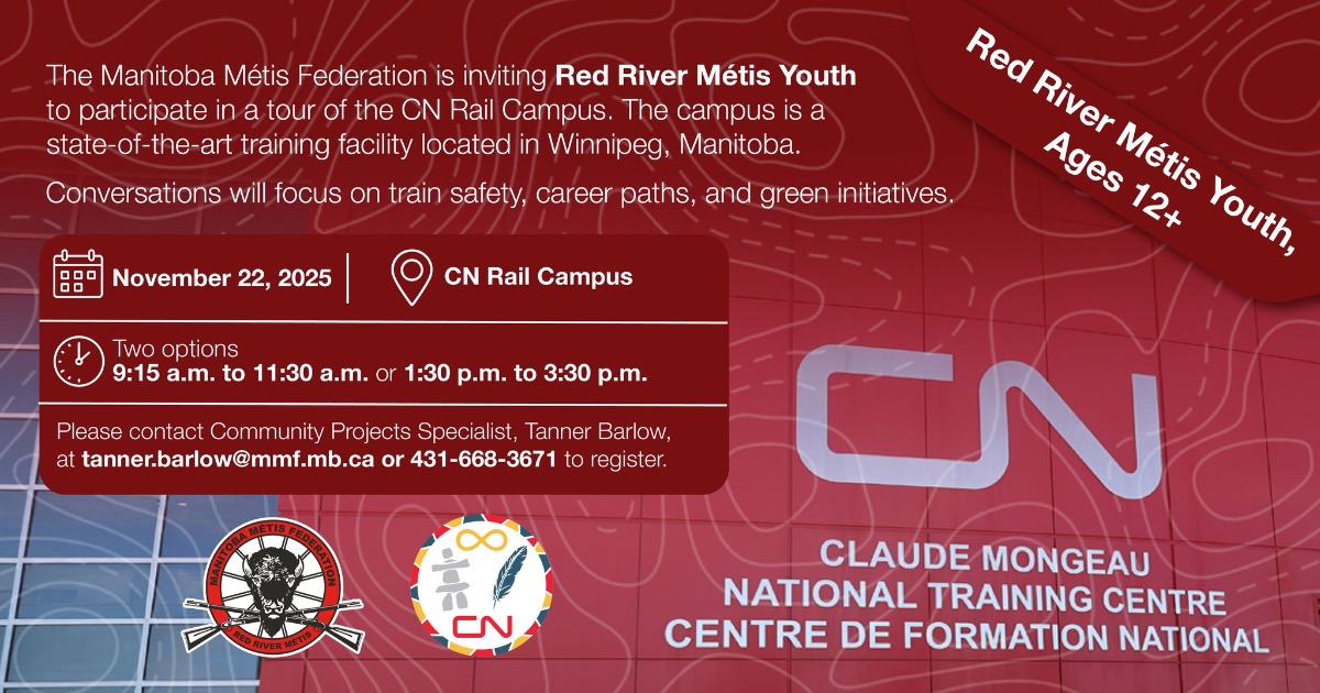 All aboard! We're inviting Red River Métis Youth ages 12+ to participate in a tour of the CN Rail Campus on November 22, 2025. The campus is a state-of-the-art training facility located in Winnipeg, Manitoba. Conversations will focus on train safety, career paths, and green initiatives.