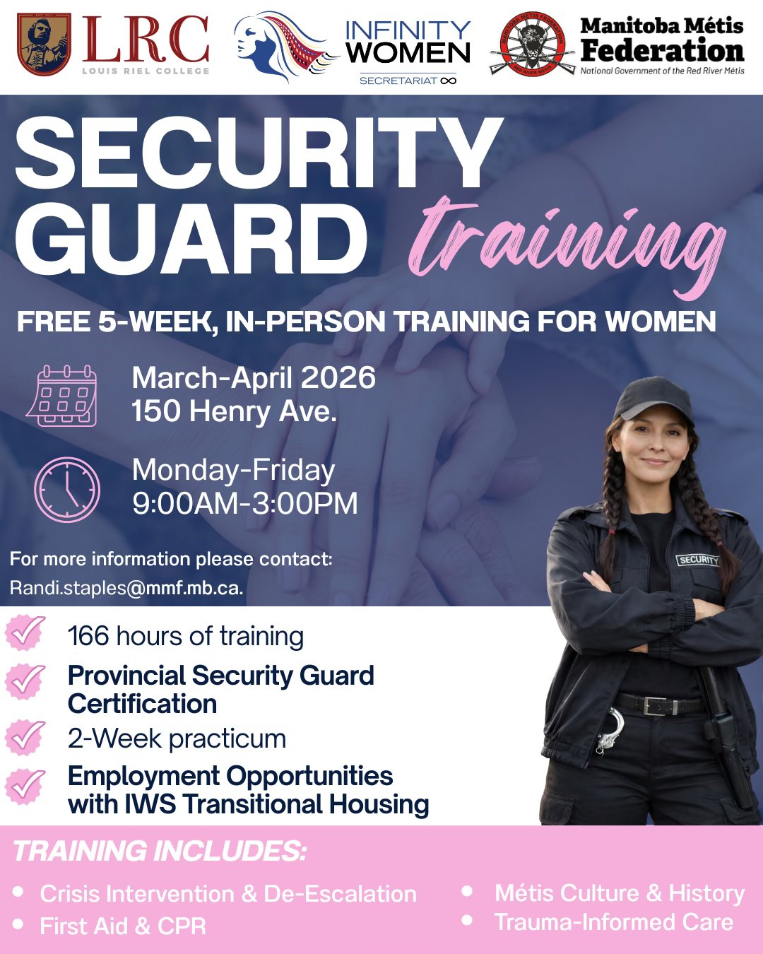 Infinity Women Secretariat is offering a 5-week, in-person Security Guard Training program designed to support Red River Métis Women in gaining confidence, certification, and practical career skills, including Crisis Intervention, First Aid & CPR, Red River Métis Culture & History, and Trauma-Informed Care.