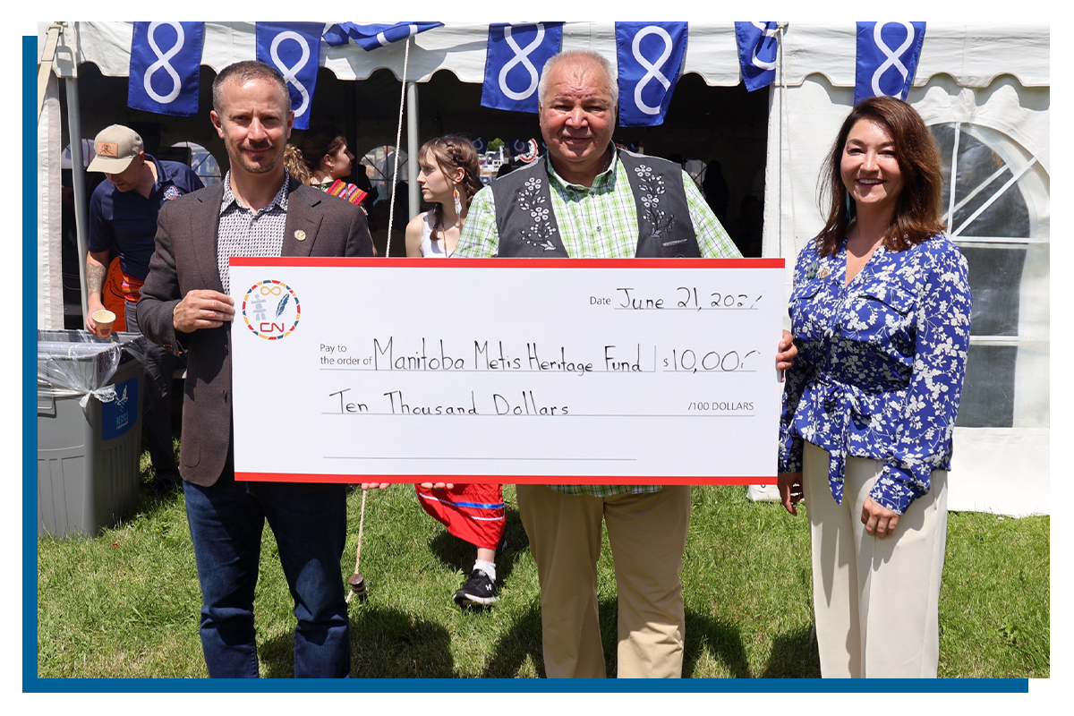 On June 20, the MMF was thrilled to join CN Rail in celebration of National Indigenous Peoples Day! The railway company graciously invited us to share our vibrant Red River Métis culture and heritage at their CN campus. The following day, CN Rail joined us in our NIPD celebrations at Selkirk Park, where they presented us with a cheque for $10,000. The donation will go towards the continued development of Michif Manor.
