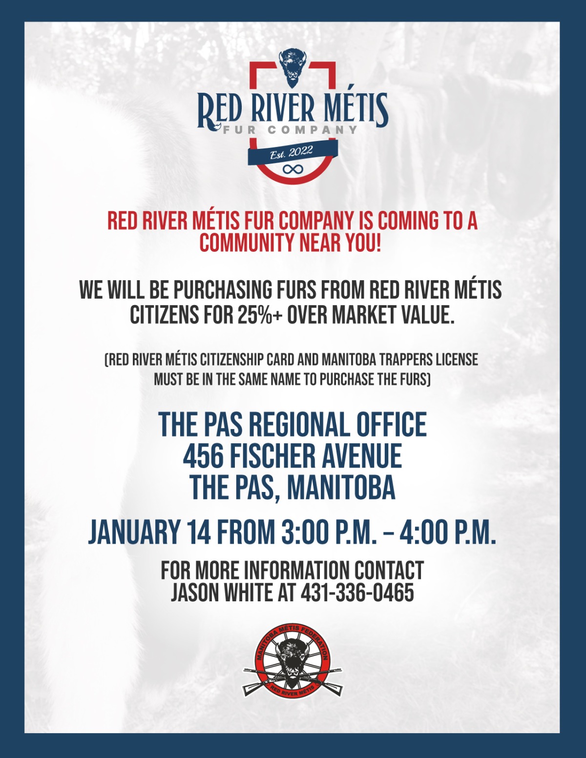 We will be purchasing furs from Red River Métis Citizens for 25%+ over market value. (Red River Métis Citizenship card and Manitoba Trappers license must be in the same name to purchase furs)