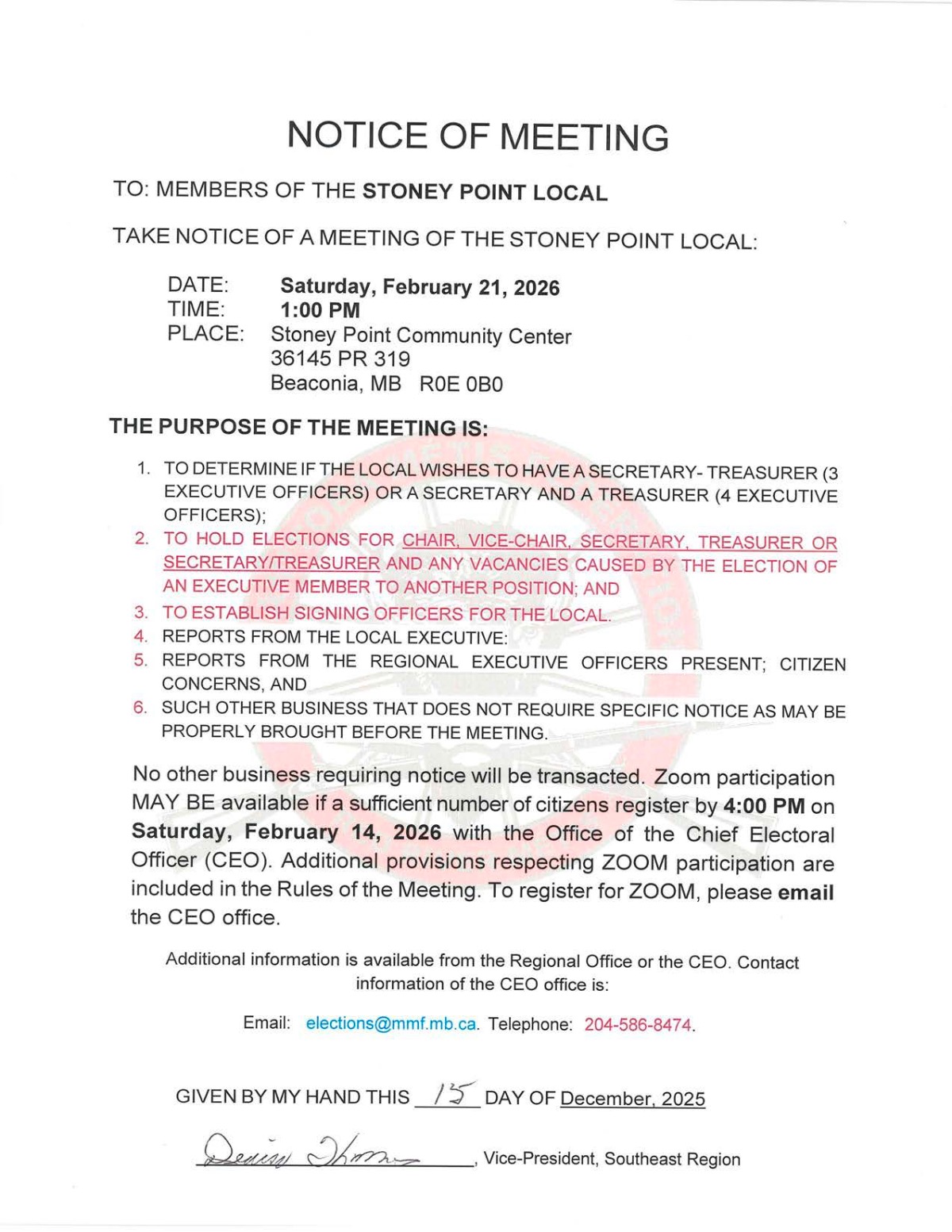 Notice of Meeting - Stoney Point Local