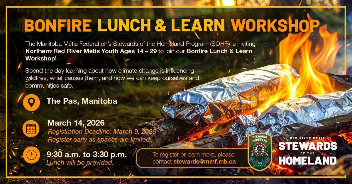 he Manitoba Métis Federation's Stewards of the Homeland Program (SOHP) is inviting Northern Red River MétisYouth ages 14 - 29 on March 14, 2026, to join our Bonfire Lunch & Learn Workshop!