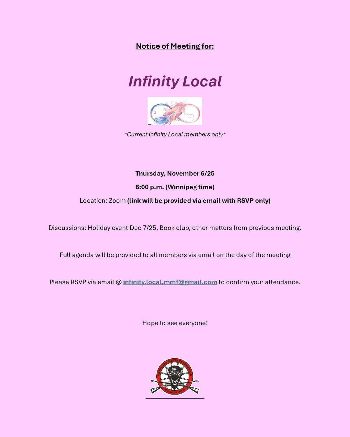 You are invited to attend our upcoming Infinity Local meeting on Thursday, November 6, 2025, at 6:00 PM CST via Zoom.